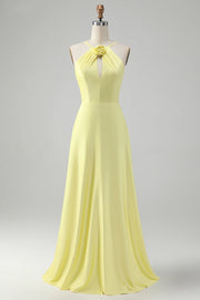 A-line hanging neck backless pleated long bridesmaid floral dress - Yellow