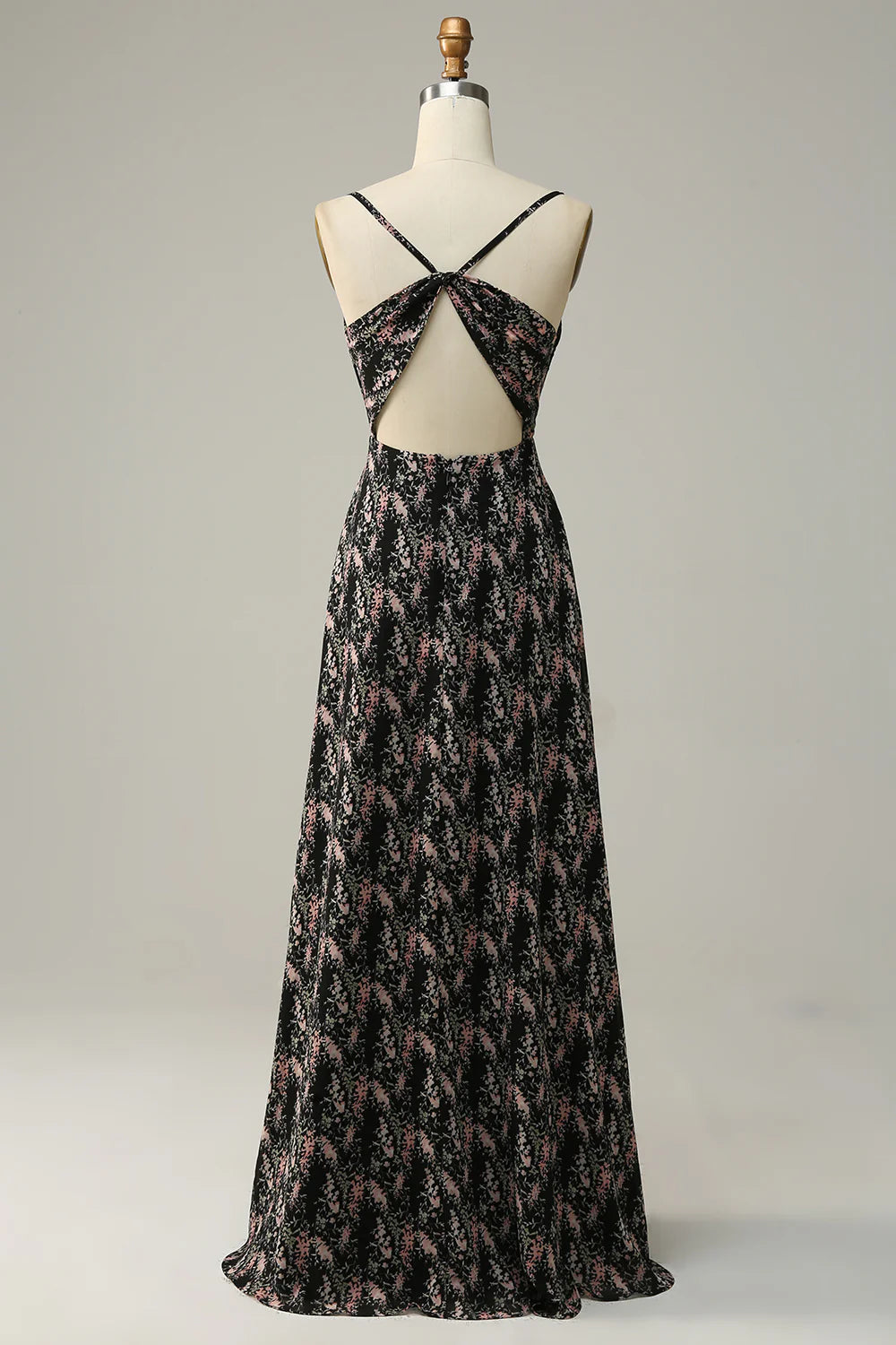 Black A Line Spaghetti Straps Floral Print Chiffon Bridesmaid Dress