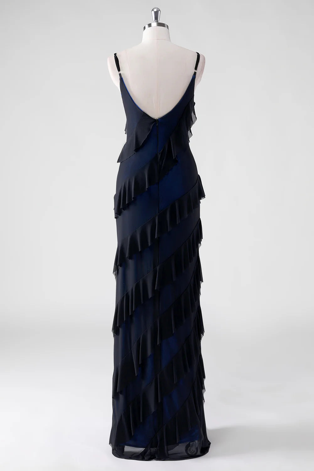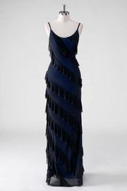 Black Blue Sheath Spaghetti Straps Tassel Long Bridesmaid Dress with Slit - US 2 / UK 6 / EU 32