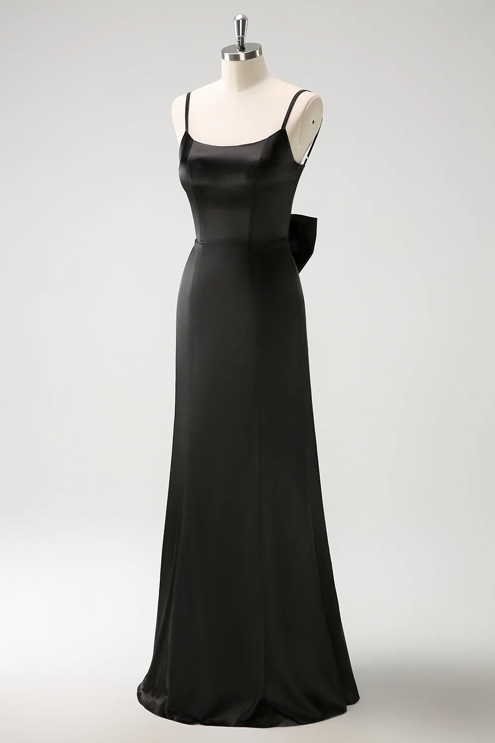 Black Mermaid Spaghetti Straps Long Ruffle Satin Bridesmaid Dress with Bow