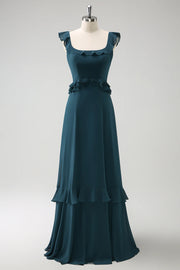 Dark Peacock Green A Line Square Neck Chiffon Long Bridesmaid Dress with Ruffles