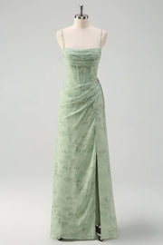 Dusty Sage Sheath Spaghetti Straps Pleated Long Bridesmaid Dress with Slit