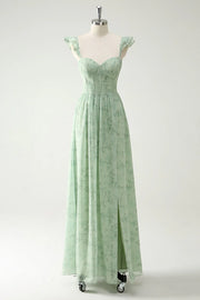 Elegant Mint Green A Line Ruffled Straps Corset Long Bridesmaid Dress with Slit