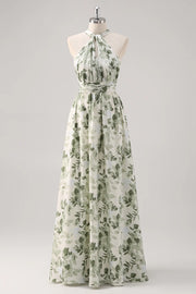 Green Flower A-Line Print Ruched Convertible Design Long Bridesmaid Dress