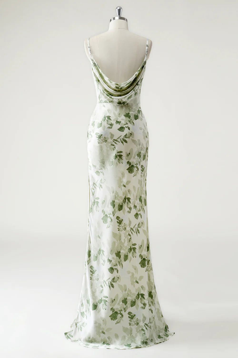 Green Flower Sheath Cowl Neck Printed Open Back Long Bridesmaid Dress