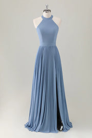 Grey Blue A Line Halter Pleated Lace Up Back Long Bridesmaid Dress with Slit
