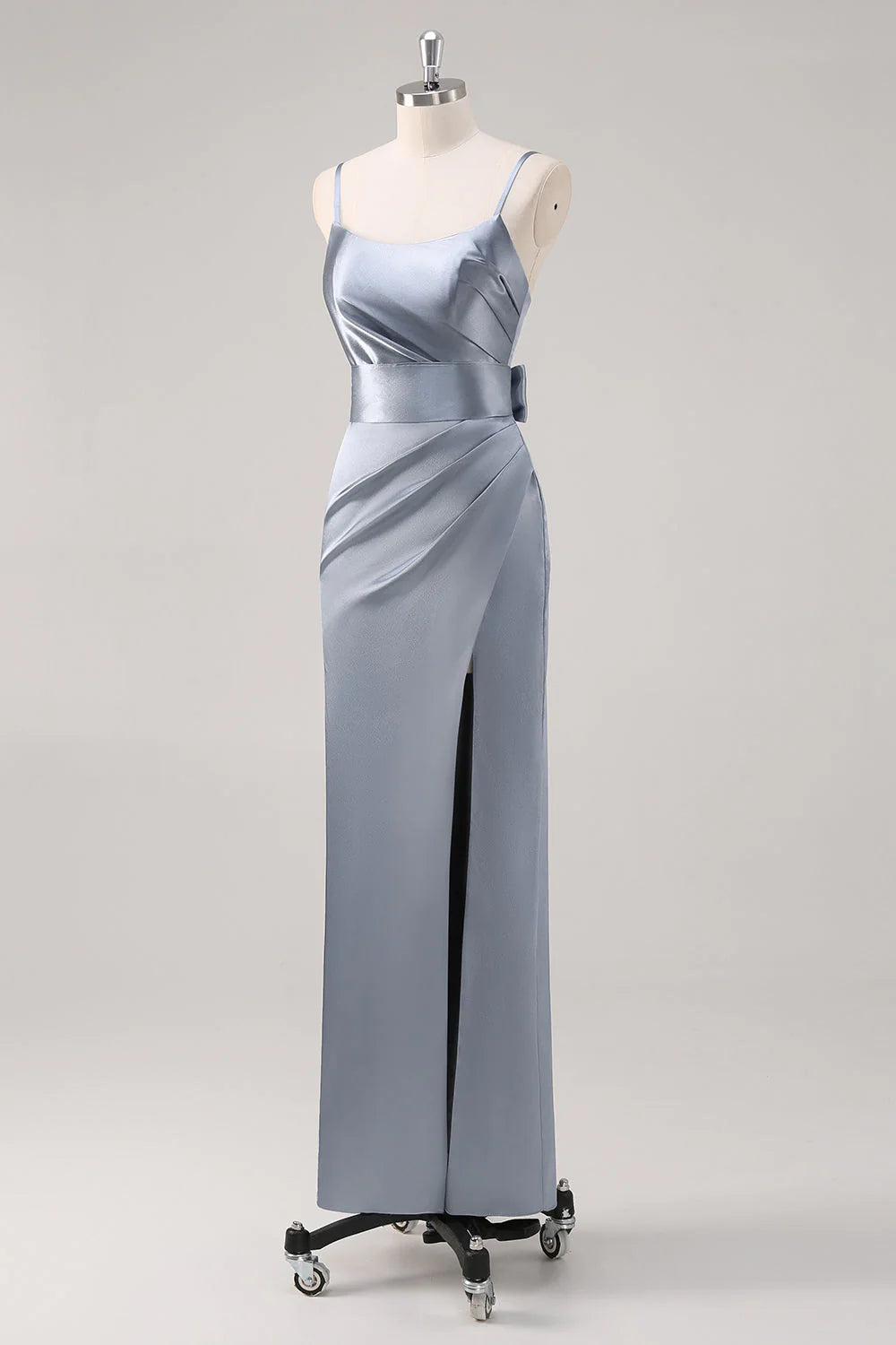 Grey Blue Sheath Ruched Spaghetti Straps Satin Long Bridesmaid Dress with Slit