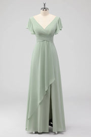 Sage Green A-Line V-Neck Chiffon Long Bridesmaid Dress with Slit