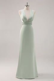 Sage Green Sheath Deep V Neck Ruched Backless Satin Long Bridesmaid Dress