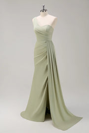 Sage Mermaid One Shoulder Ruched Side Overskirt Long Bridesmaid Dress With Slit
