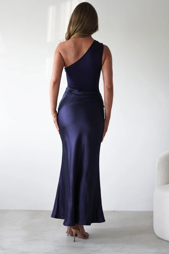 Asymmetric shoulder strap close fitting hip hugging long skirt dress