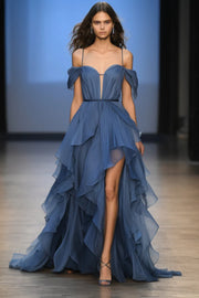 Deep blue slim suspender chiffon flowing party dress