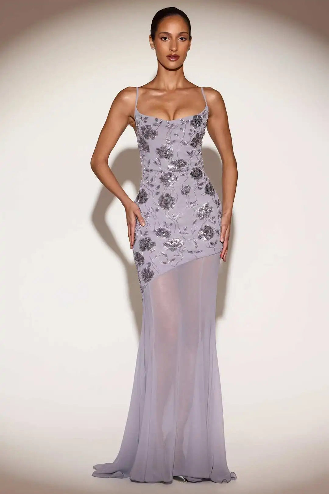 Fashionable Dusty Grey Sequin Floral Embellished Spaghetti Strap Square Neck Open Back Sheer Chiffon Mermaid Maxi Evening Dress - US 2 / UK 6 / EU 32