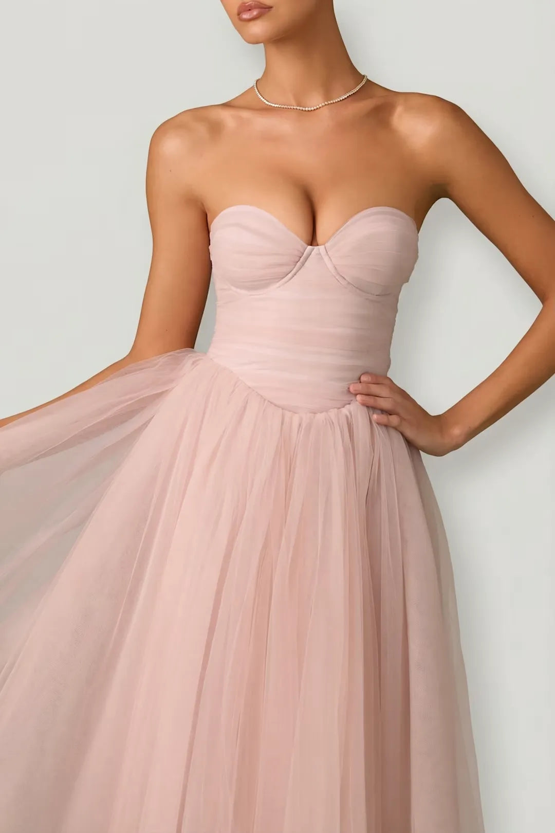 KANGQIAO's romantic and elegant midi dress is crafted from soft, airy layered tulle in a gentle blush pink shade, delivering a dreamy, lightweight and fluffy wearing experience. It features a classic sweetheart strapless neckline that perfectly sculpts the chest line and highlights the delicate collarbone and shoulder lines, with delicate ruched detailing at the waist to cinch the figure and create a slim, flattering silhouette. The sleek open back design adds a touch of subtle allure, while the flowy A-line tulle skirt falls gracefully to a midi length, swinging gently with movement for a sweet, fairy-tale like charm. Versatile and timeless, it is the perfect choice for bridesmaid events, garden weddings, cocktail parties, birthday celebrations, date nights and all feminine romantic occasions.
