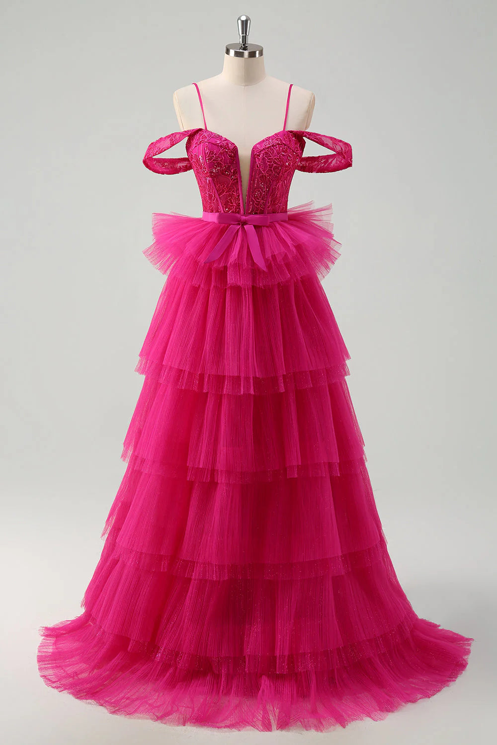 Hot Pink A-Line Cold Shoulder Tulle Tiered Sequin Long Prom Dress with Appliques