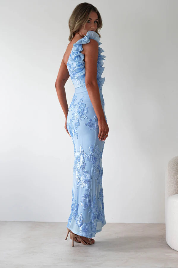 Irregular shoulder strap waist cinching lace dress