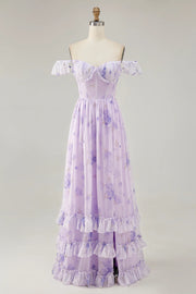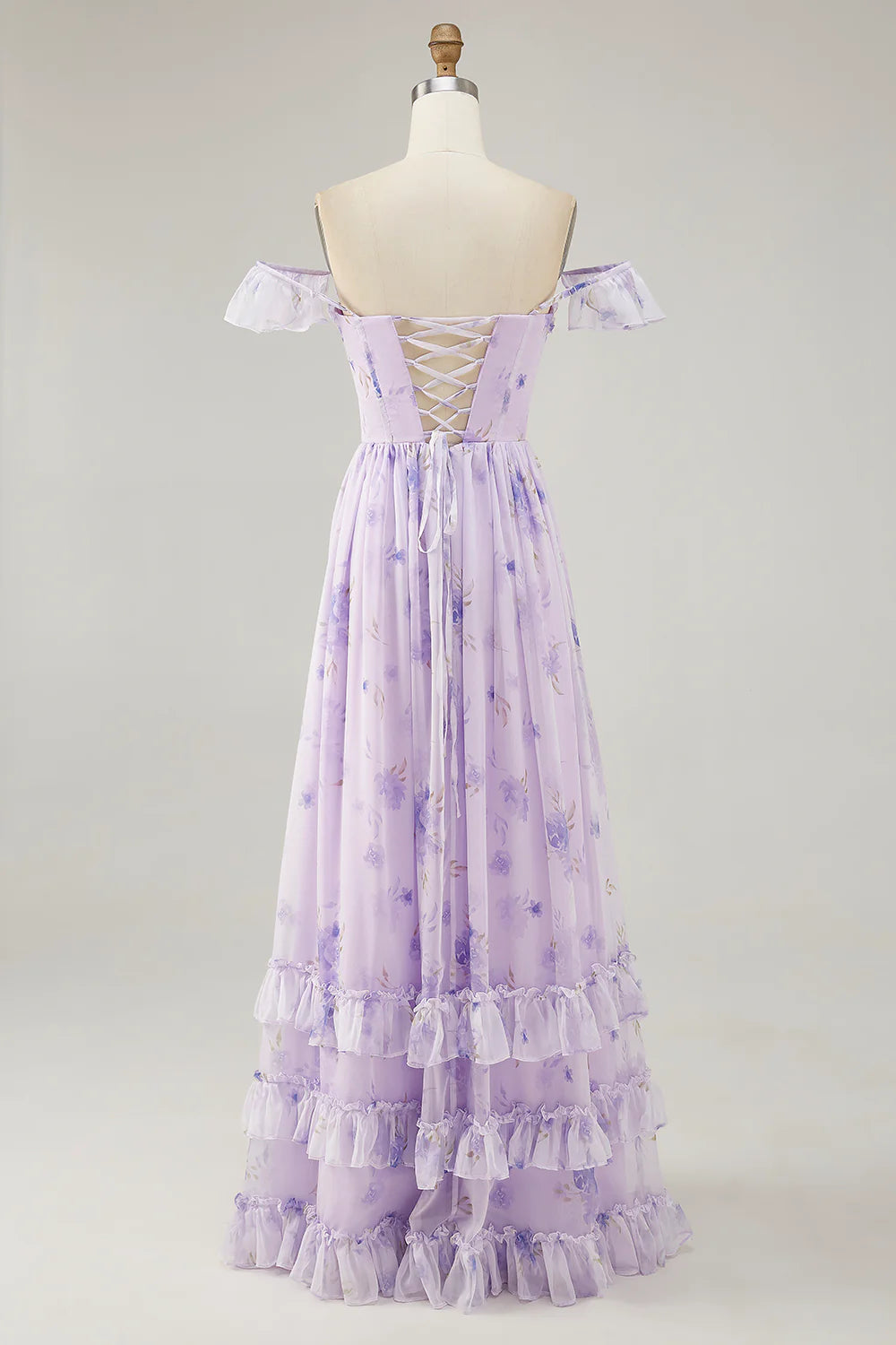 Lavender A-line Corset Lace Up Back Print Long Bridesmaid Dress with Slit