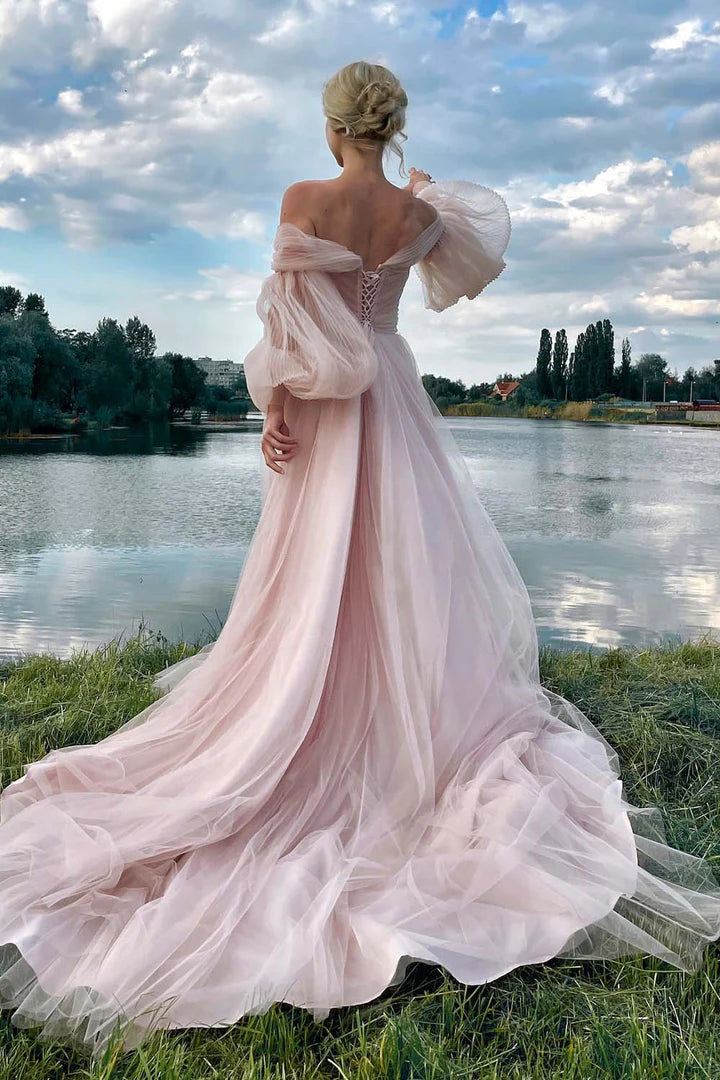 Long Sleeves Light Pink Tulle Prom Gown - US 2 / UK 6 / EU 32