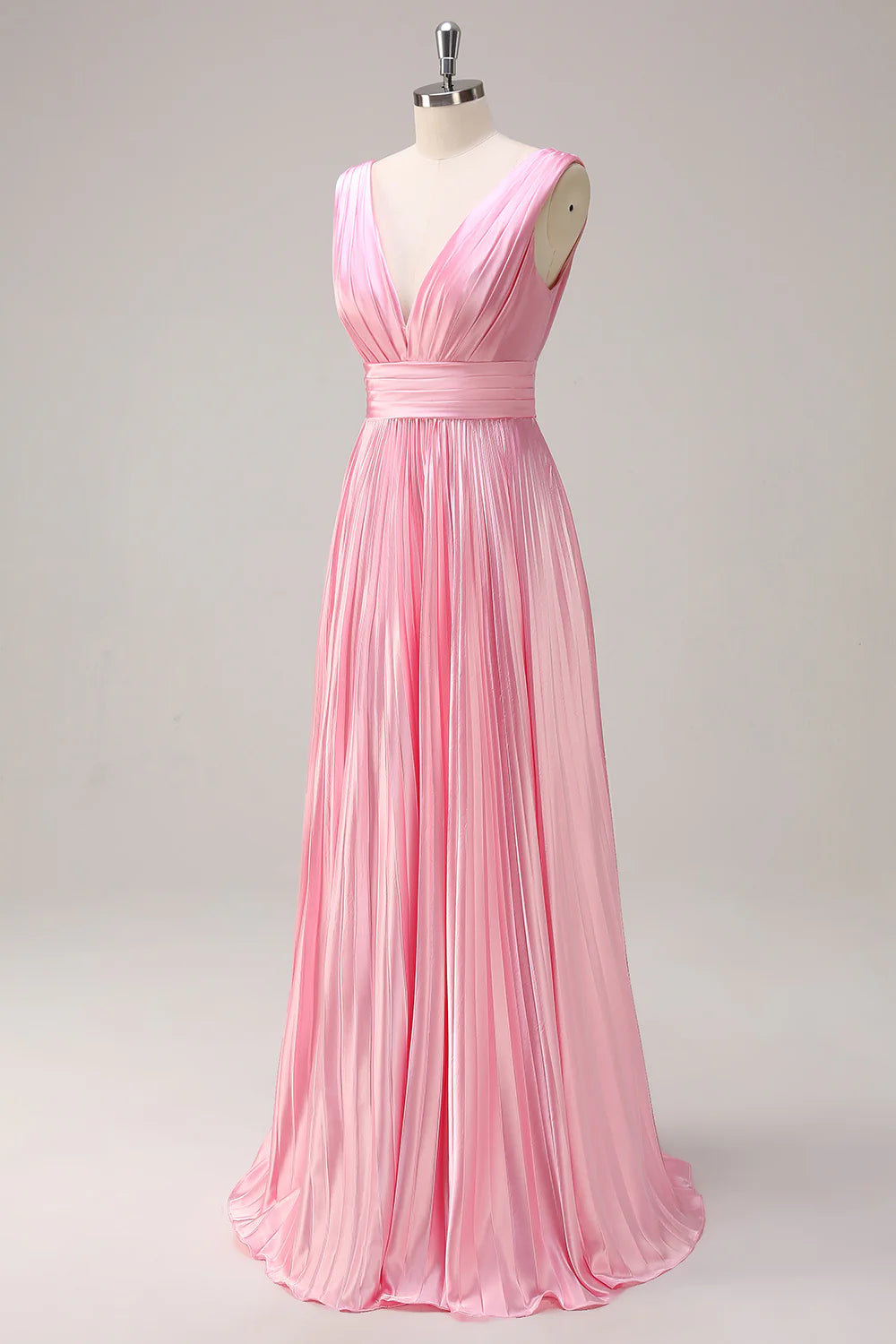 Pink A Line V Neck Ruched Open Back Bright Satin Long Bridesmaid Dress