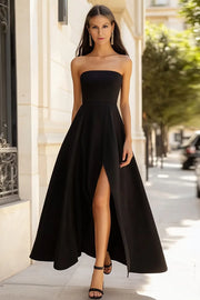 Simple A Line Strapless Long Black Tie Dress With Slit