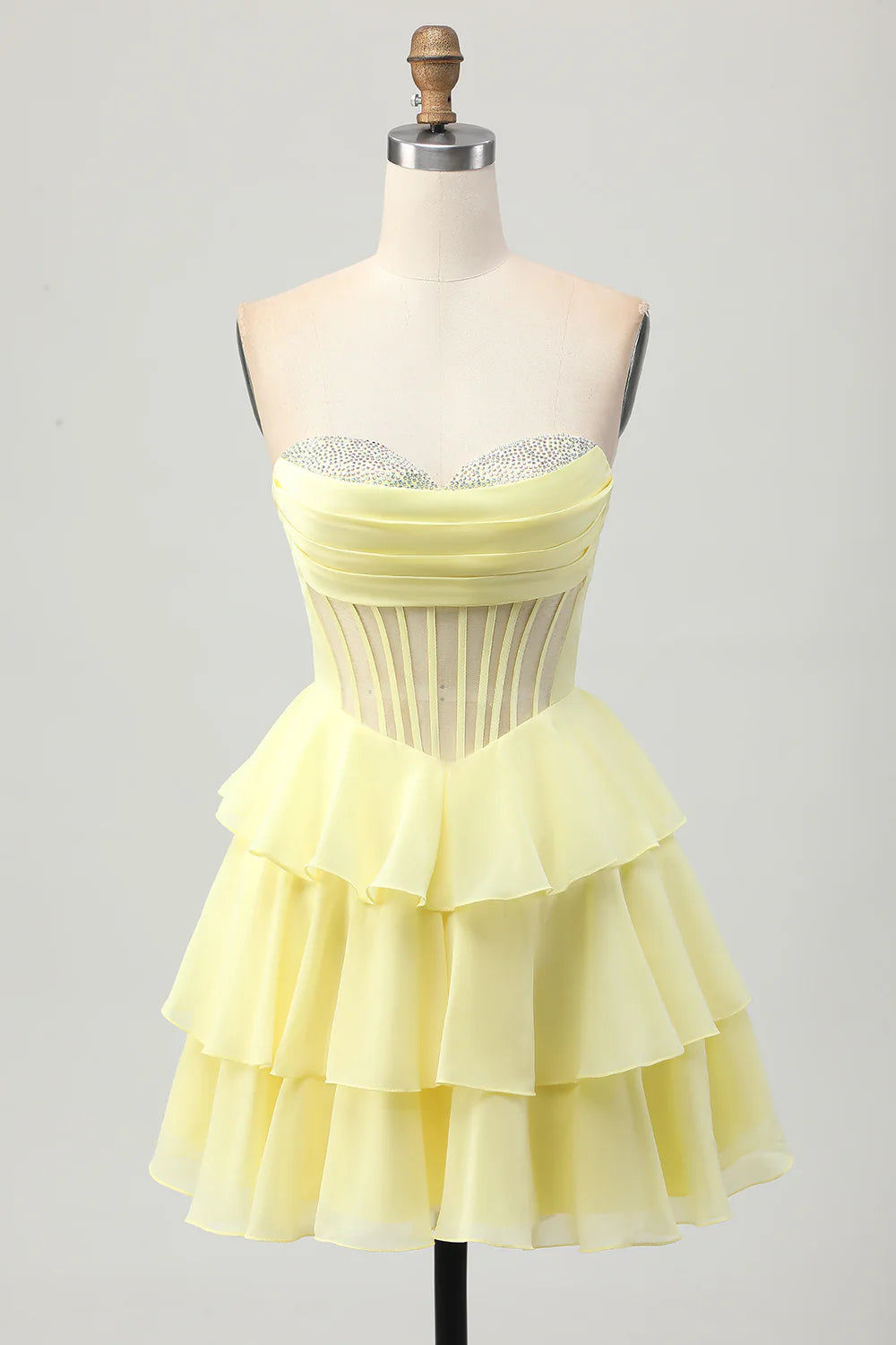 A-line strapless layered tight corset beaded back to school dress - Yellow / US 2 / UK 6 / EU 32