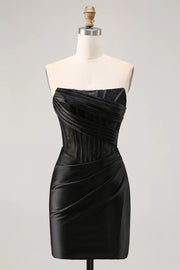 Black Strapless Satin Corset Ruched Bodycon Homecoming Dress