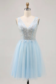 Blue A Line V-Neck Floral Appliqued Short Homecoming Dress