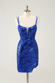 Glittler Royal Blue Spaghetti Straps Lace Up Short Homecoming Dress with Slit