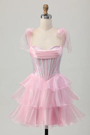 Pink Corset A Line Tiered Beaded Short Homecoming Dress with Straps Bow
