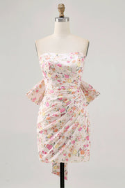 Pink Flower Bodycon Strapless Ruched Short Homecoming Dress with Bow