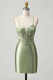 Sage Green Tight Satin Short Appliqued Homecoming Dress with Lace Up Back