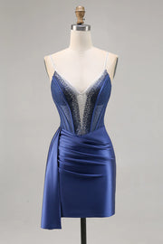 Sparkling navy blue tight satin beaded back to school dress