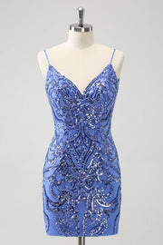 Sparkly Blue Spaghetti Straps Tight Sequin Short Homecoming Dress