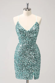 Sparkly Blue Tight Lace Up Back Sequin Short Homecoming Dress with Slit