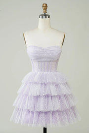 Sparkly Lilac A Line Strapless Polka Dots Corset Tiered Short Homecoming Dress
