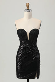 Sparkly Strapless Tight Sequins Short Black Homecoming Dress with Slit