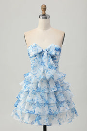 Strapless White Blue Flower A-line Tiered Short Homecoming Dress with Bow