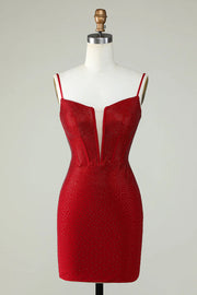 Thin shoulder strap deep V-short back to school dress with beads - Red / US 2 / UK 6 / EU 32