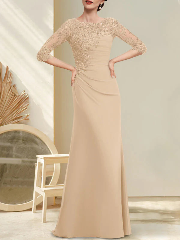 A-line Scoop Floor-Length Chiffon Lace Mother of the Bride Dress With Beading Pleated Sequins