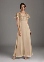 This custom mother of the bride dress features a flattering A-line silhouette in a soft champagne hue. Delicate lace detailing enhances the V-neckline and flutter sleeves, while a scoop back with discreet zip closure ensures an elegant fit. The floor-length design creates a graceful, timeless look ideal for formal celebrations. Crafted with attention to detail, this gown combines classic charm with modern sophistication for a memorable occasion.
