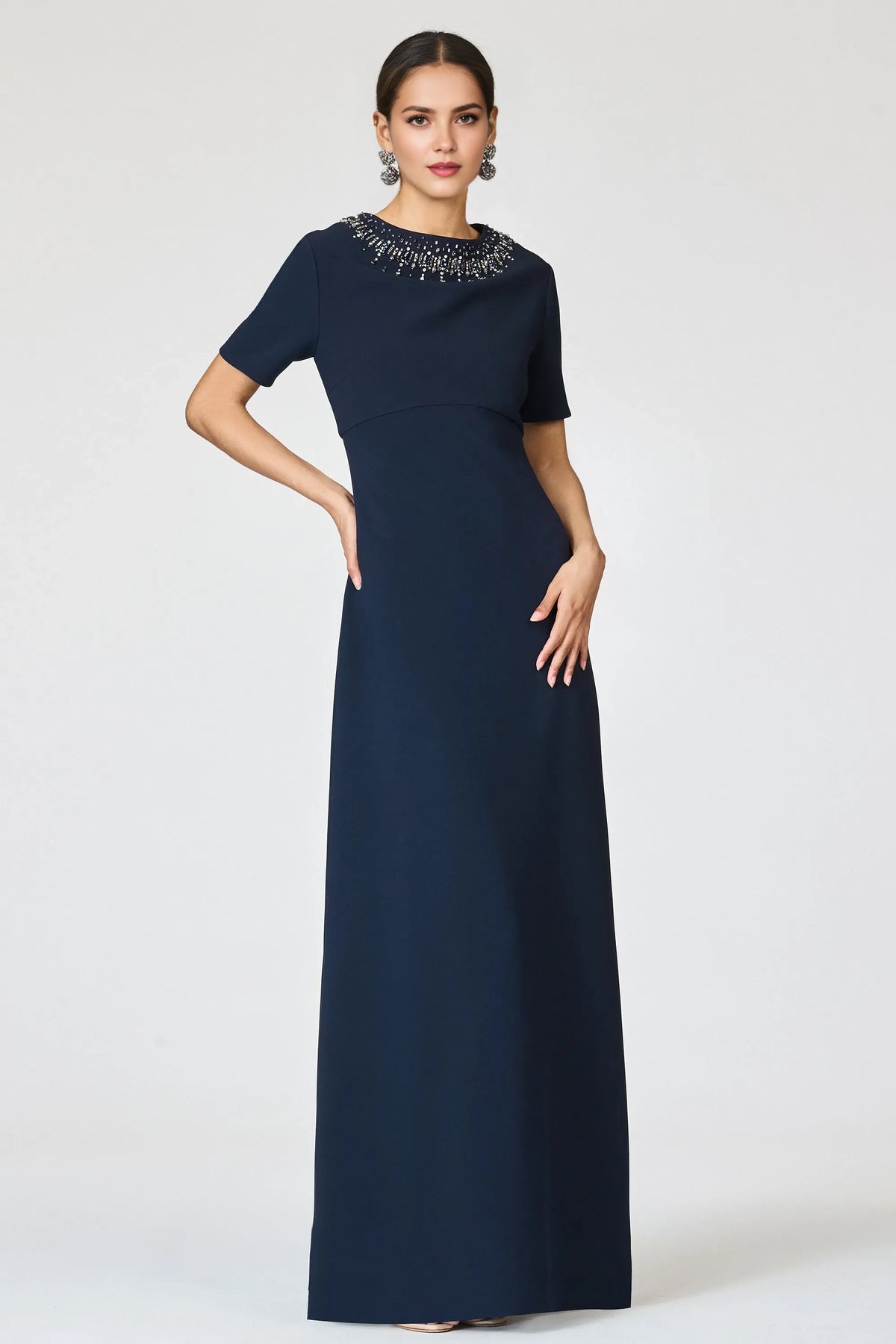 Kangqiao's simple yet elegant wedding mother's gown is crafted from a flowing matte fabric. The round neck and short sleeves flatter the shoulders and neck, while the delicate beaded embellishments at the neckline add a touch of sophistication. The straight silhouette is sleek and slimming, and the button detail at the back adds a touch of detail and elegance. Paired with a floor-length skirt, it is suitable for formal occasions such as church weddings and banquets, making it the top choice for mothers who appreciate understated luxury.