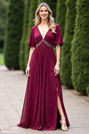 A-Line Deep V-Neck Mother of the Bride Dress. Occasions: Prom, black tie events, formal weddings, and upscale parties.