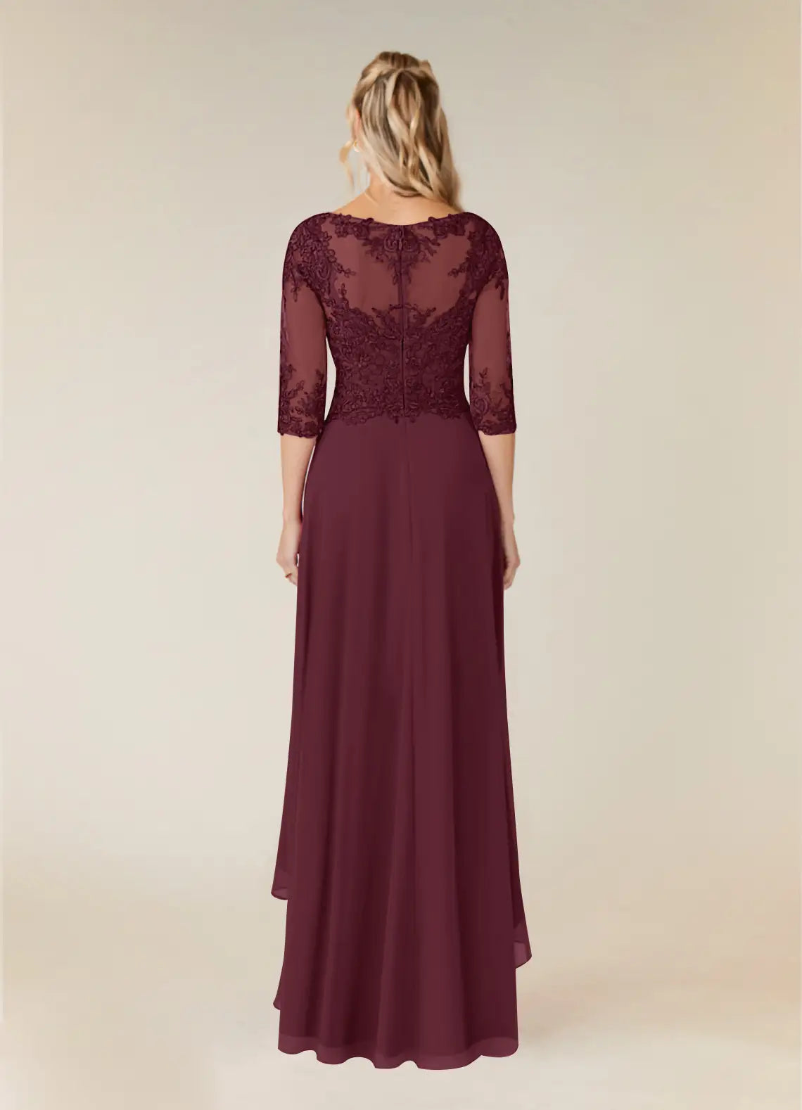 This Romantic A-Line Mother of the Bride dress features delicate lace, a flattering scoop neckline, and elegant three-quarter sleeves. Its illusion back with a zip closure adds subtle sophistication, while the asymmetrical hemline brings a modern touch. Designed for comfort and style, this dress is perfect for celebrating special occasions with grace and confidence.