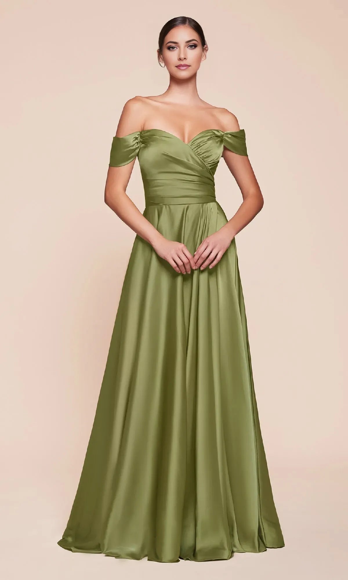 Elegant A-Line Off-Shoulder Sleeveless Back Zipper Ruched Bodice Floor Length Satin Prom Dress - Olive Green / US 2 / UK 6 / EU 32