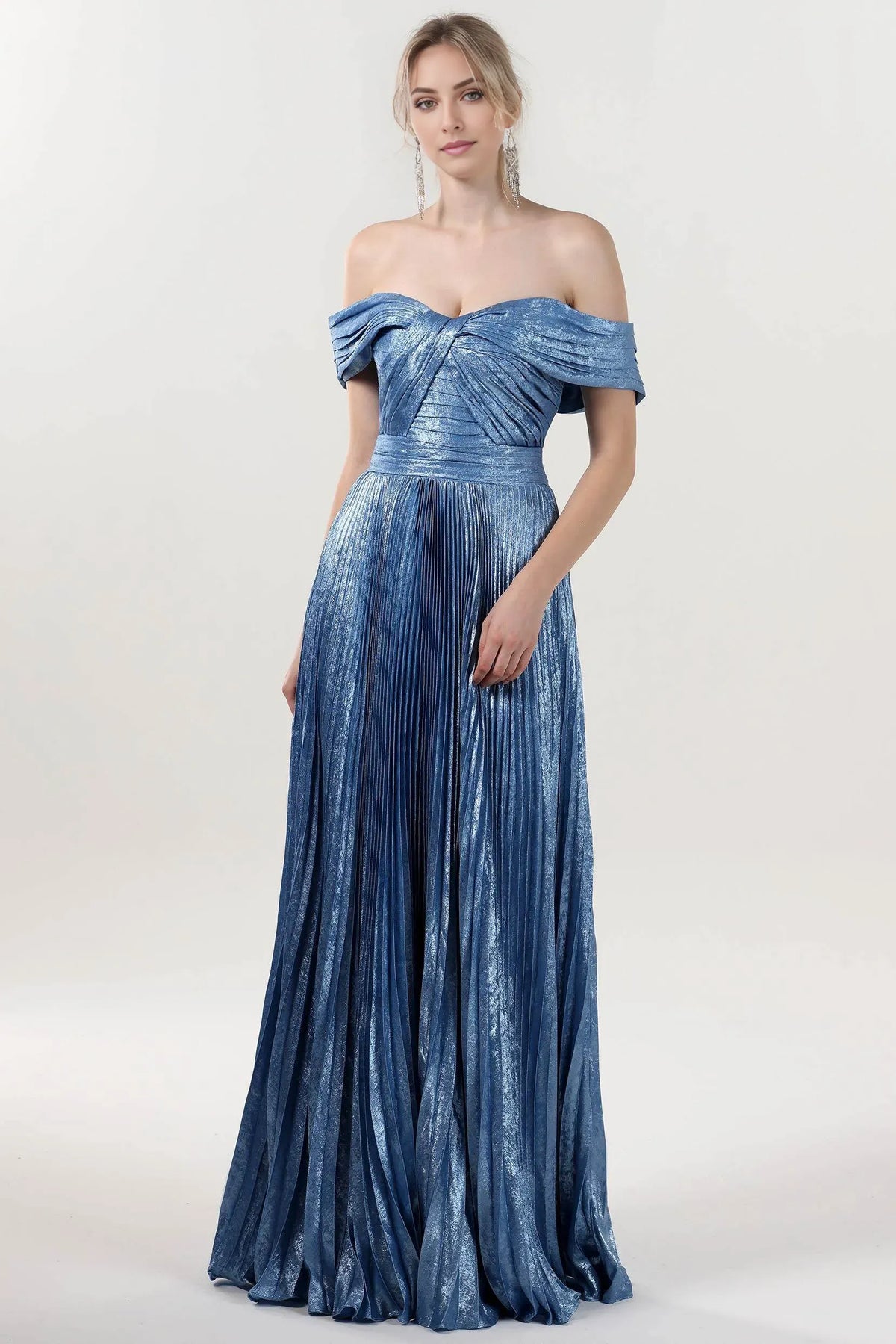 Sparkle Ice Blue A-Line Off-the-Shoulder Sleeveless Back Zip Floor-Length Metallic Pleated Prom Dress - US 2 / UK 6 / EU 32