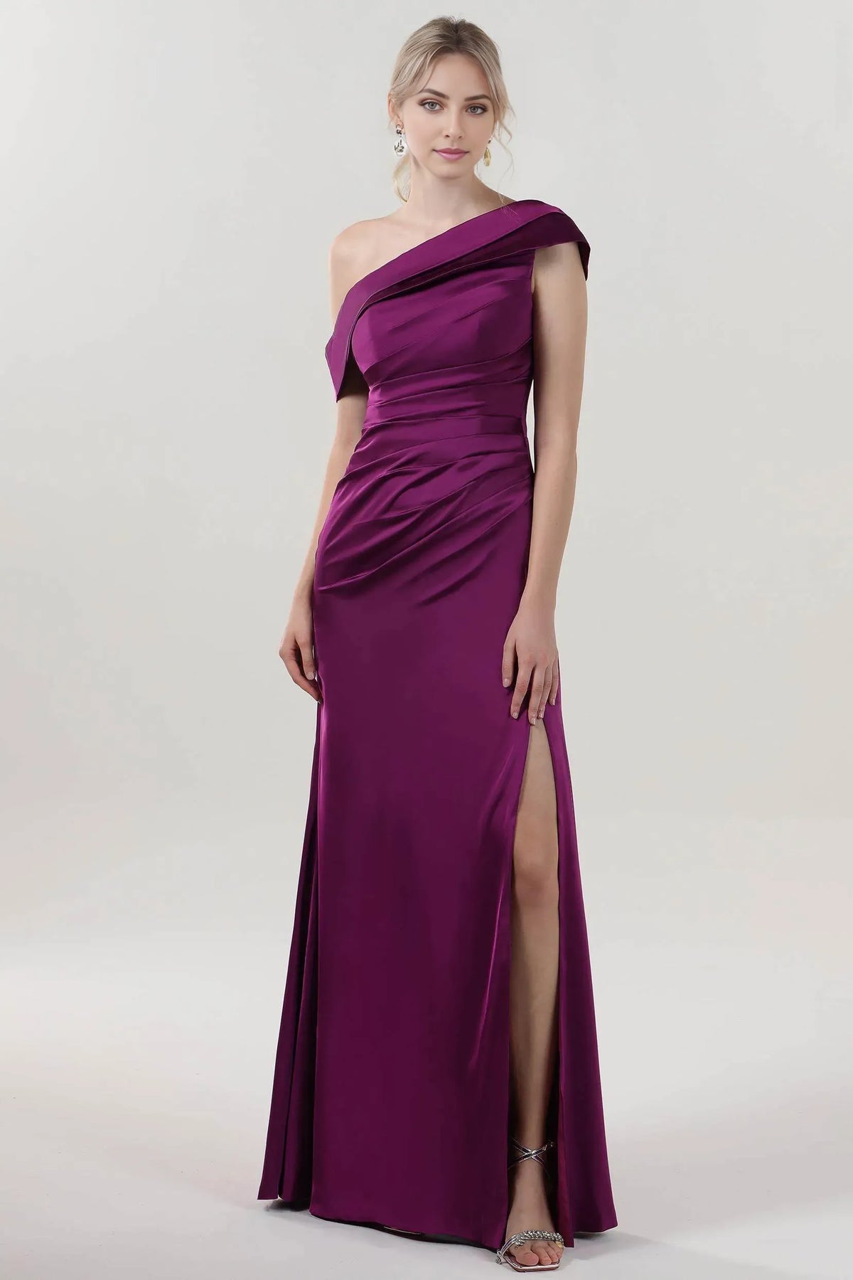 Romantic Dark Purple Sheath/Column One-Shoulder Sleeveless Back Zip Floor-Length Satin Ruched Prom Dress with High Slit - US 2 / UK 6 / EU 32