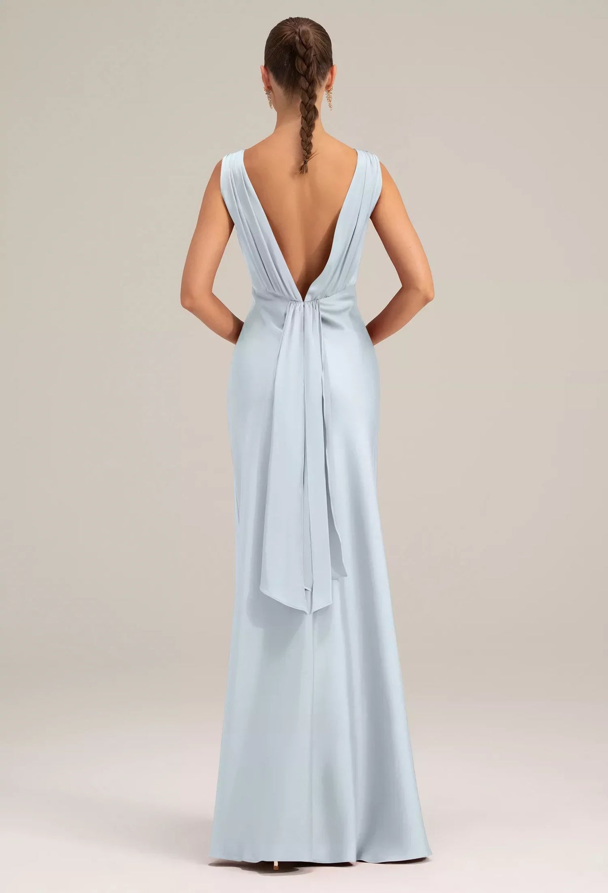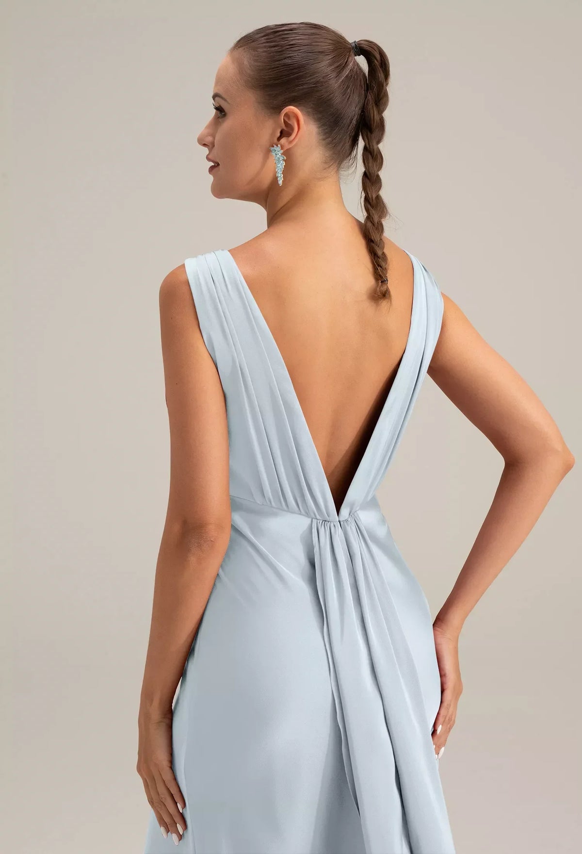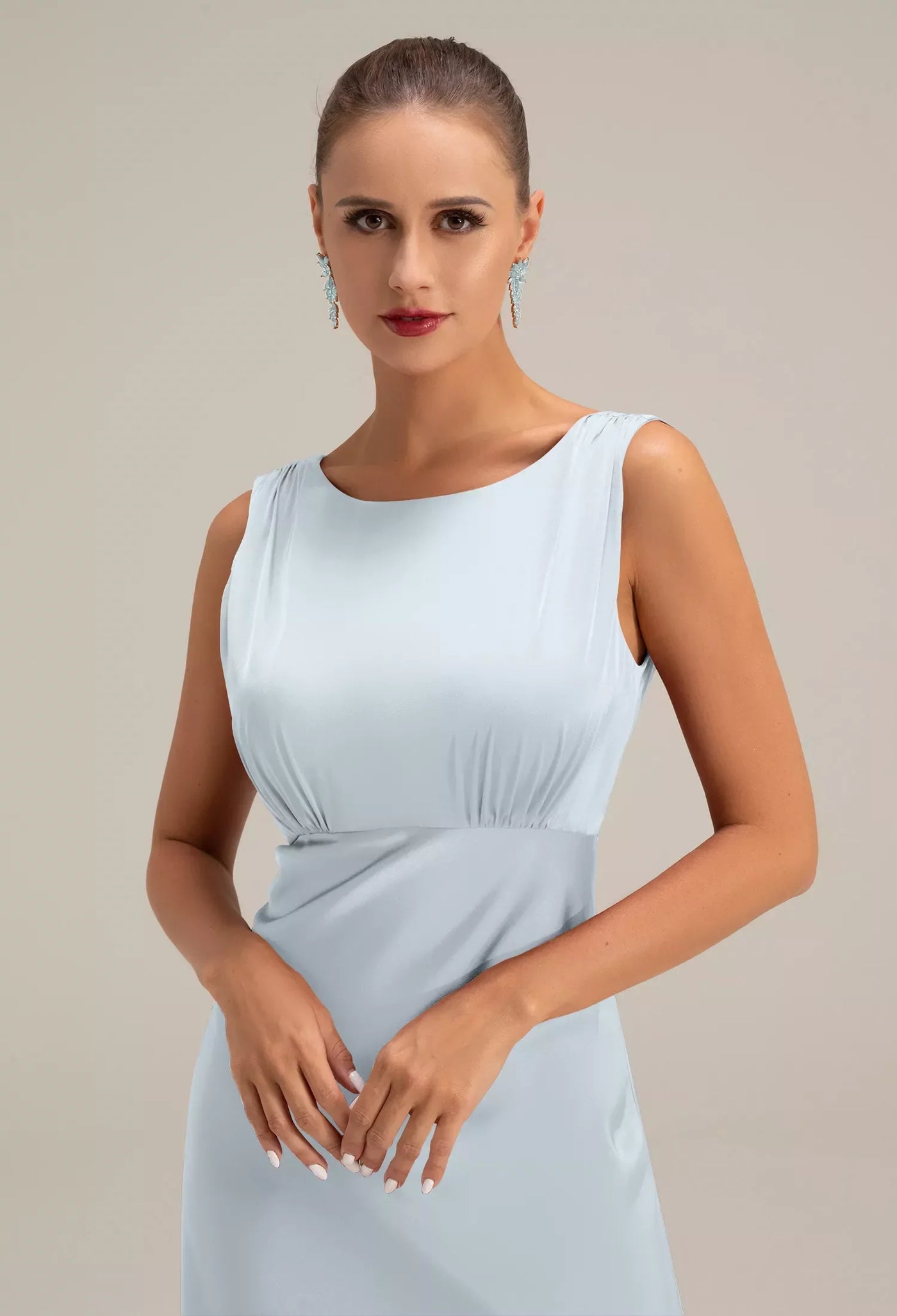 sjzca's elegant and sophisticated ball gown is crafted from a light blue matte fabric. The round neck and sleeveless design offer a simple yet chic look, while the fitted mermaid silhouette flatters the figure. The deep V-back with cutouts and flowing ribbons adds a touch of refinement, and the draped skirt has a graceful, flowing sheen. Suitable for formal occasions such as balls and banquets, it is the top choice for women who appreciate an elegant and minimalist style.