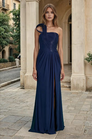 Elegant Navy Sheath One-Shoulder Sleeveless Back Zip Floor-Length Ruched Chiffon Prom Dress with High Slit