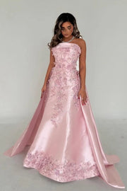 Elegant Pink A-Line Strapless Satin Party Dress with Appliques and Court Train