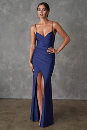 Elegant Sheath Deep V-Neck Spaghetti Strap Back Zip Floor-Length Ruched Satin High-Slit Prom Dress